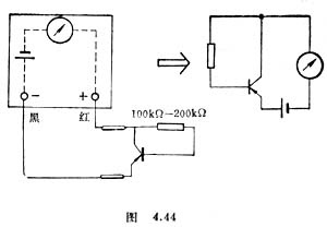 使基极空着,用多用[电]表的黑表笔接其中的一脚(假设为发射极),用细表笔接另一只脚(设为集电极),这时应有一个较大的电阻读教,即流过表头的电流很小。在基极和红表笔之间接一只100200千欧的电阻如图444,或用湿润的拇指和食指同时捏住基极和集电极(两电极不能相碰)这时三极管的基极回路接通,产生基极电流(由黑表笔进入,经发射极、基极、偏流电阻、红表笔回到表头),集电极电流增大,电阻读数减小。记下这时发射极和集电极之间的阻值,并与基极开路时测得的阻值比较,二者相差越大,即表头指针偏角增加的幅度越大,β值就越大。